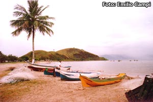 | Romance: águas calmas, turvas e pouco profundas; coqueiros na orla. | |