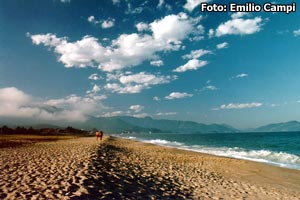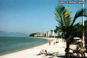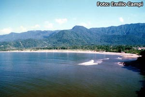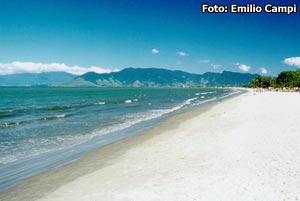 Porto Novo: areia compacta e escura; praia de águas calmas; presença de mangue junto ao rio juqueriquerê. |